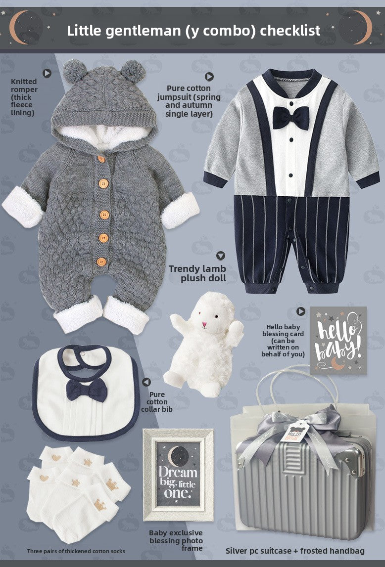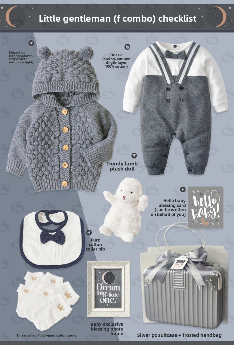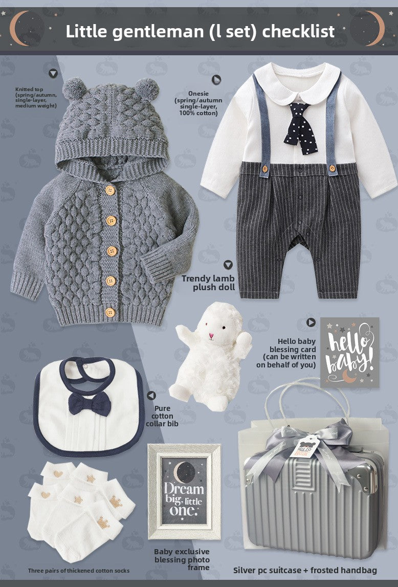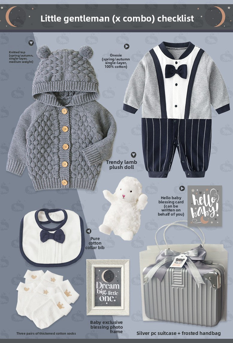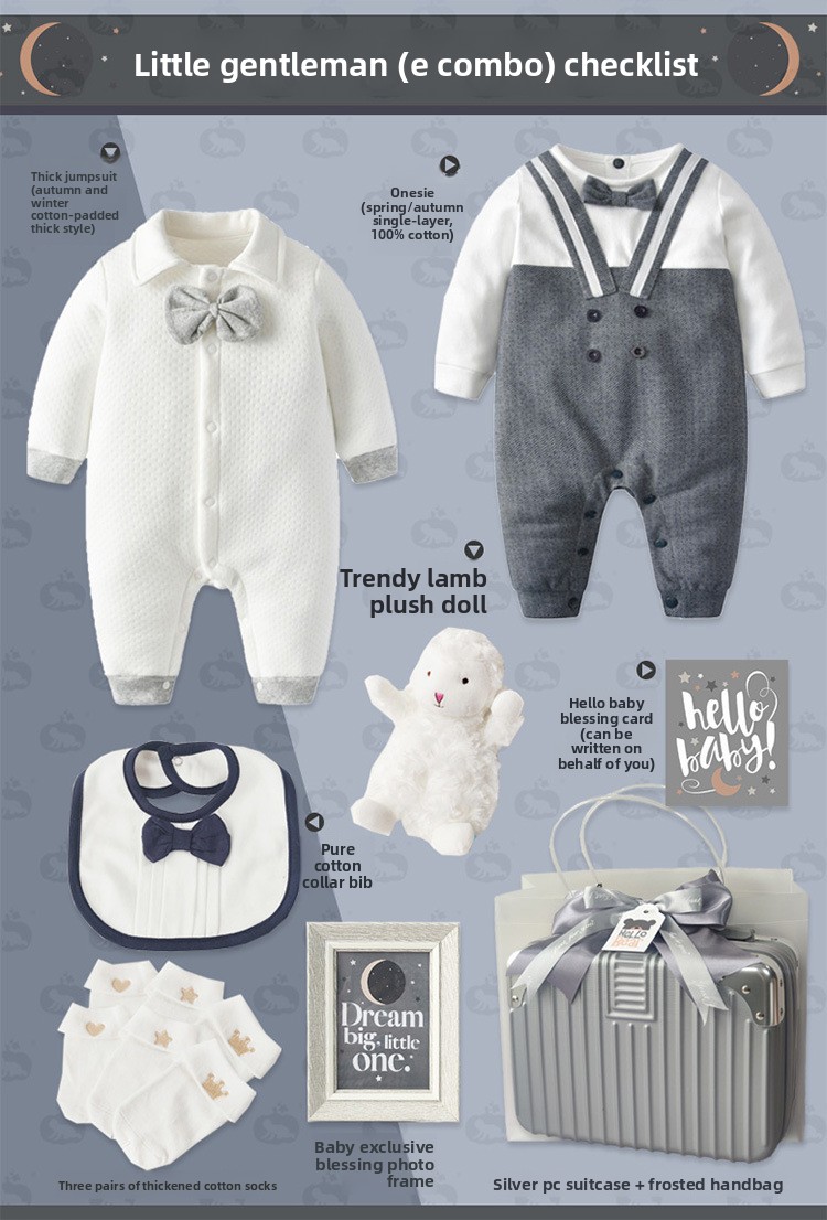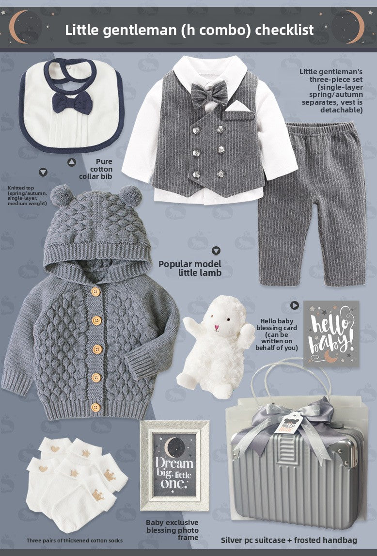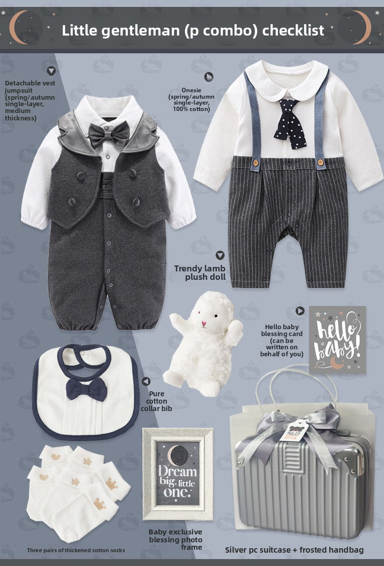 Gentleman Style: Elegant baby suit set with sophisticated design for special occasions Cotton Material: Soft, breathable fabric for comfortable wear and sensitive skin Multi-piece Set: Complete outfit including clothing and accessories in one package Four-season Wear: Suitable for spring, autumn, and winter with appropriate thickness Gift Packaging: Presented in a stylish suitcase-style box, ready for gifting