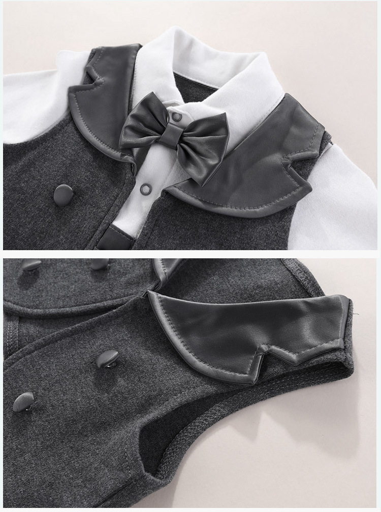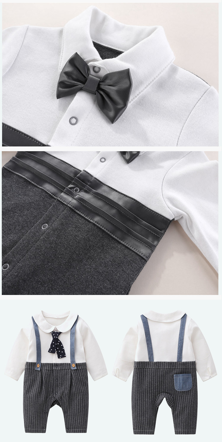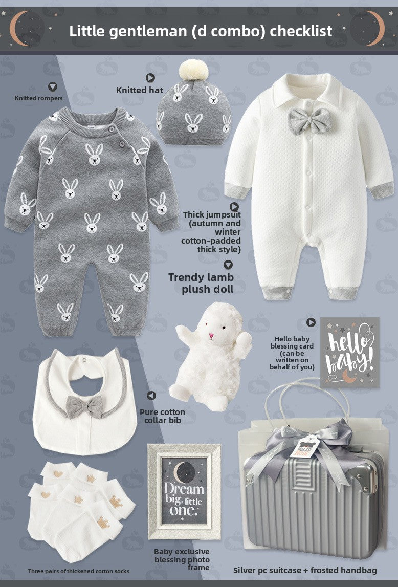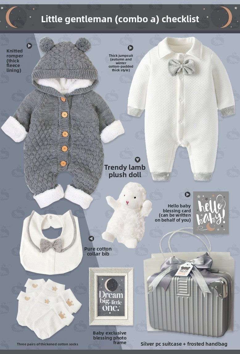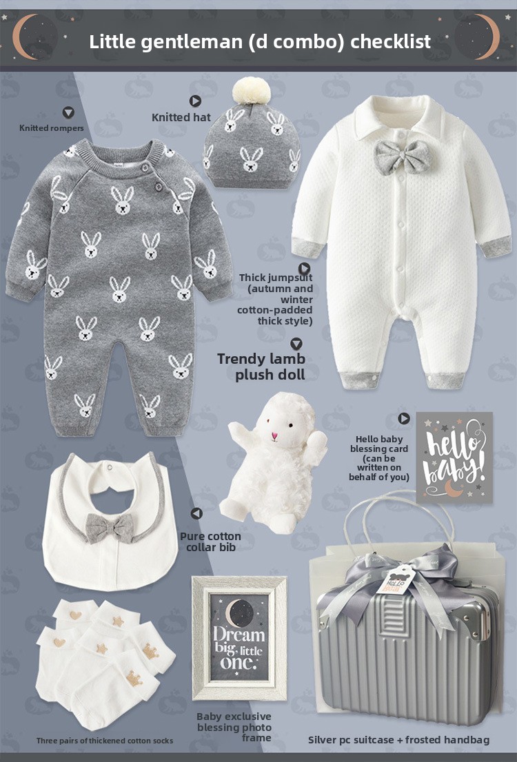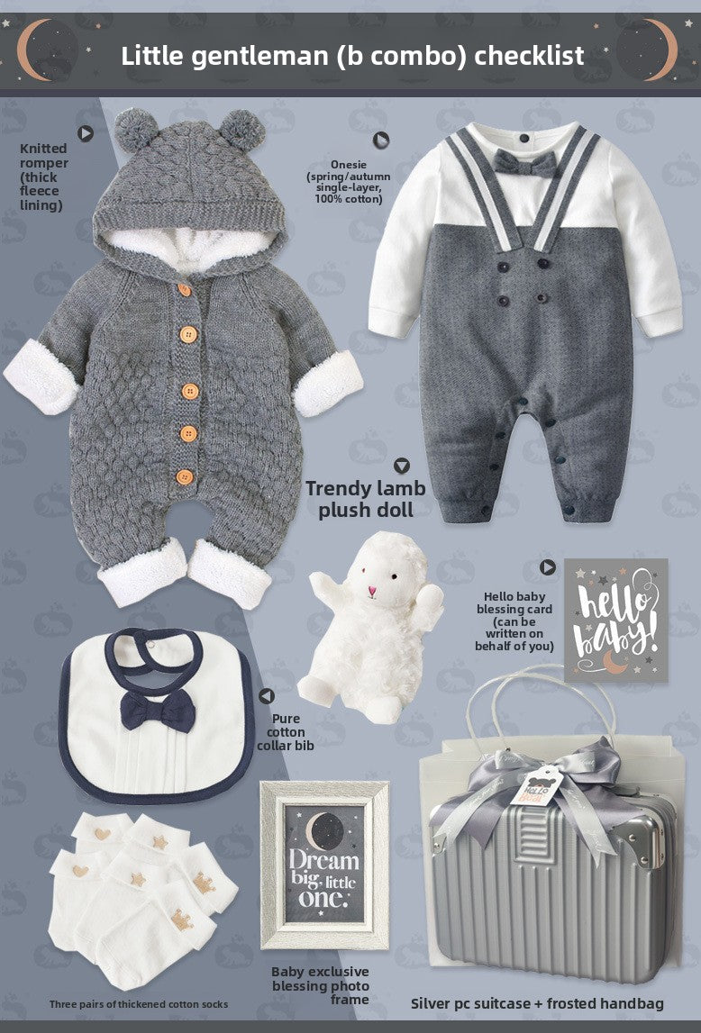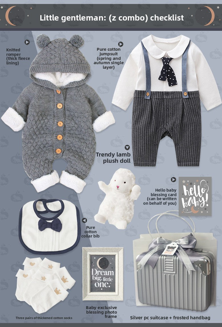 Gentleman Style: Elegant baby suit set with sophisticated design for special occasions Cotton Material: Soft, breathable fabric for comfortable wear and sensitive skin Multi-piece Set: Complete outfit including clothing and accessories in one package Four-season Wear: Suitable for spring, autumn, and winter with appropriate thickness Gift Packaging: Presented in a stylish suitcase-style box, ready for gifting